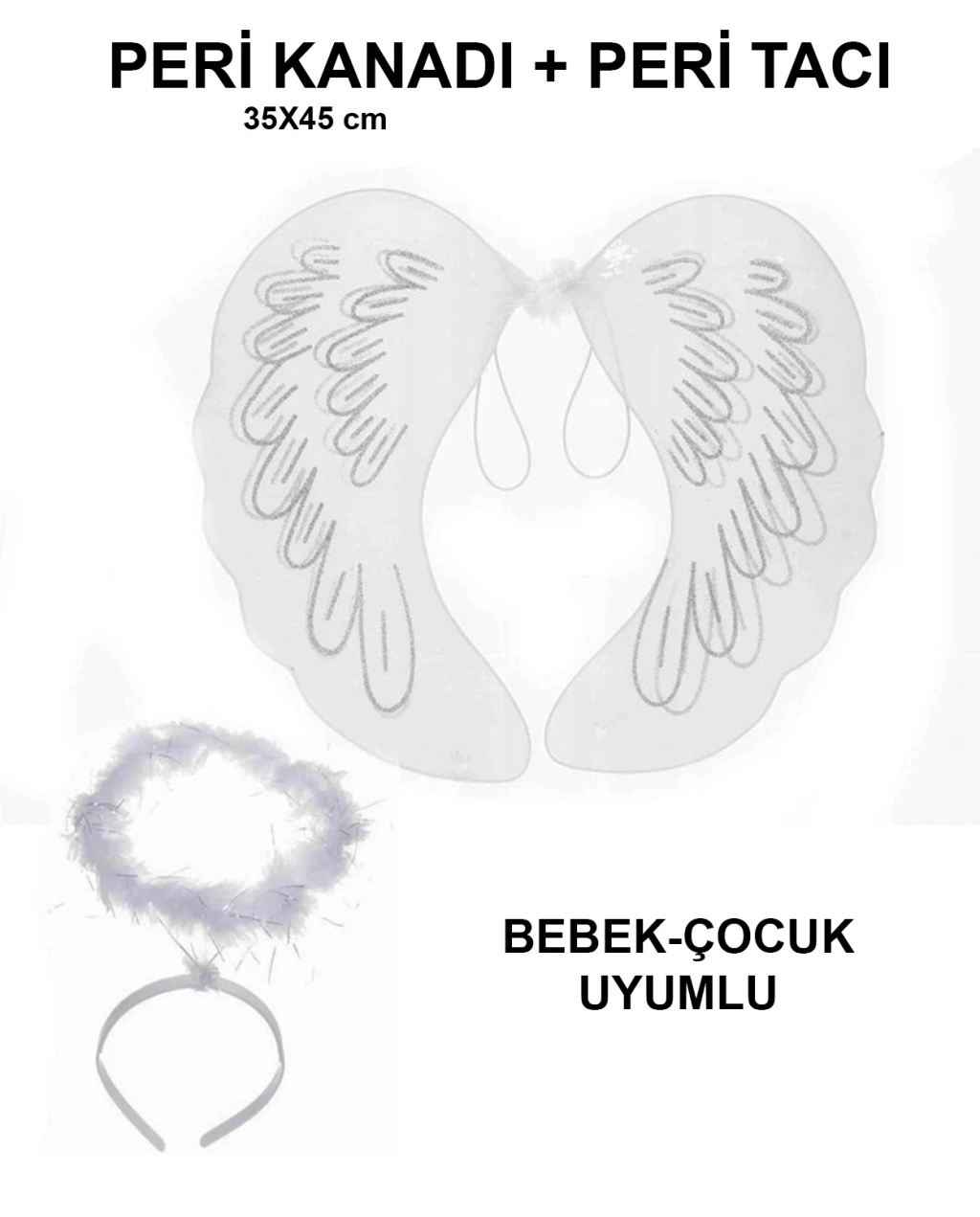 Paket içerisinde 1 Adet Beyaz Peri Kanadı ve 1 Adet Beyaz Otrişli Peri Tacı Bulunmaktadır