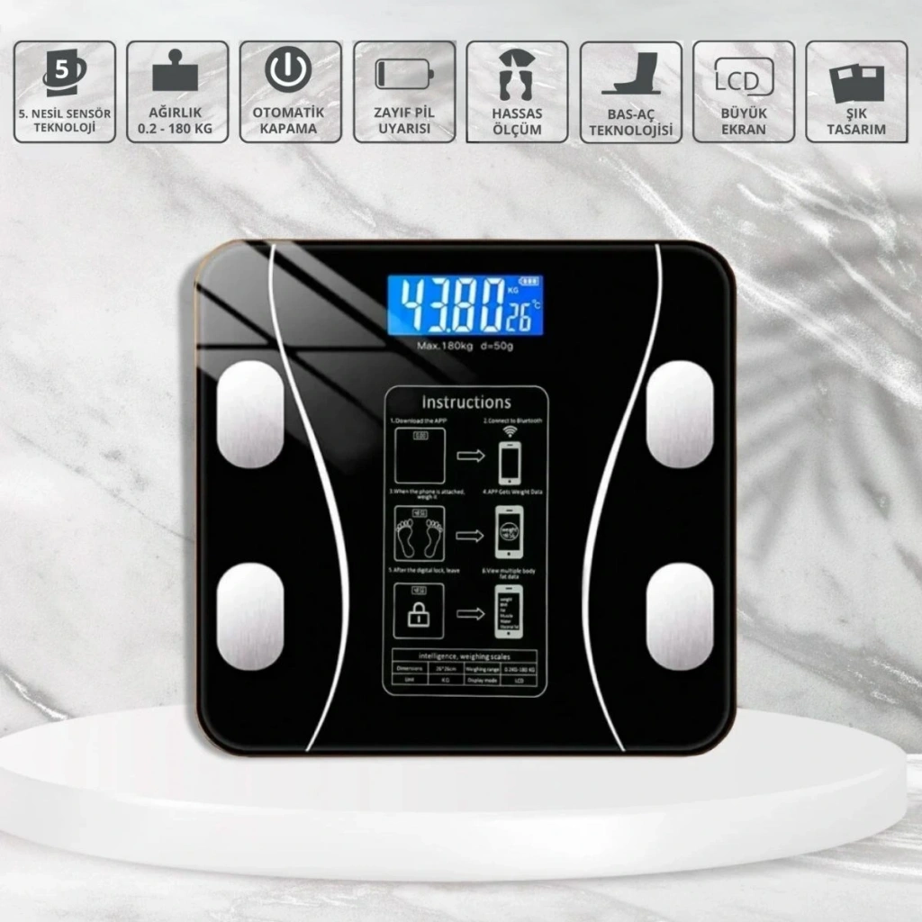 Sağlığınızı kontrol altında tutmanın en akıllı yolu! Bu dijital yağ ölçer fonksiyonlu akıllı baskül, yalnızca kilonuzu değil; vücut yağ oranı, kas kütlesi, su oranı, kemik yoğunluğu ve daha birçok değeri hassas şekilde ölçerek size kapsamlı bir analiz sunar.