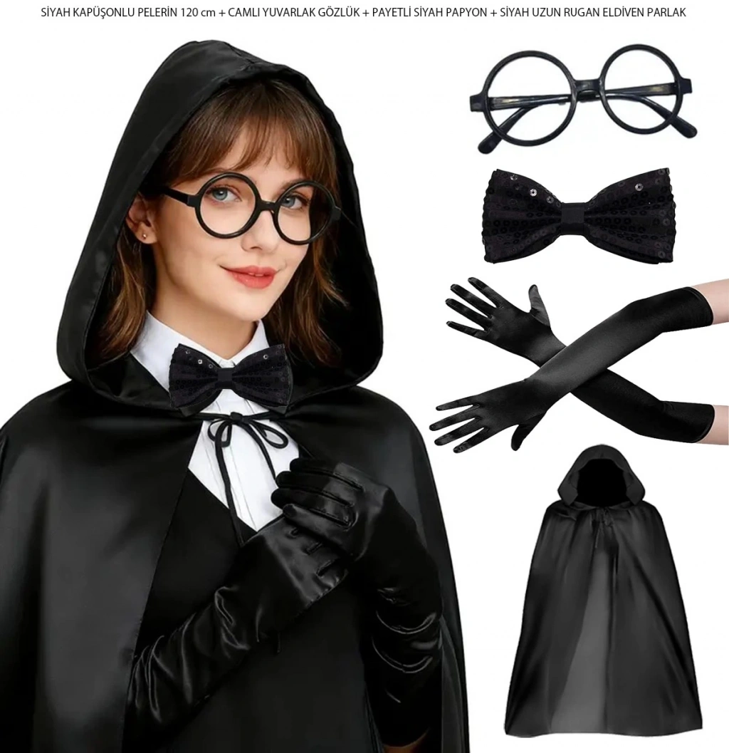 Cadı ve Büyücü Kostüm Seti 120 cm Siyah Kapüşonlu + Gözlük + Papyon + Uzun Eldiven